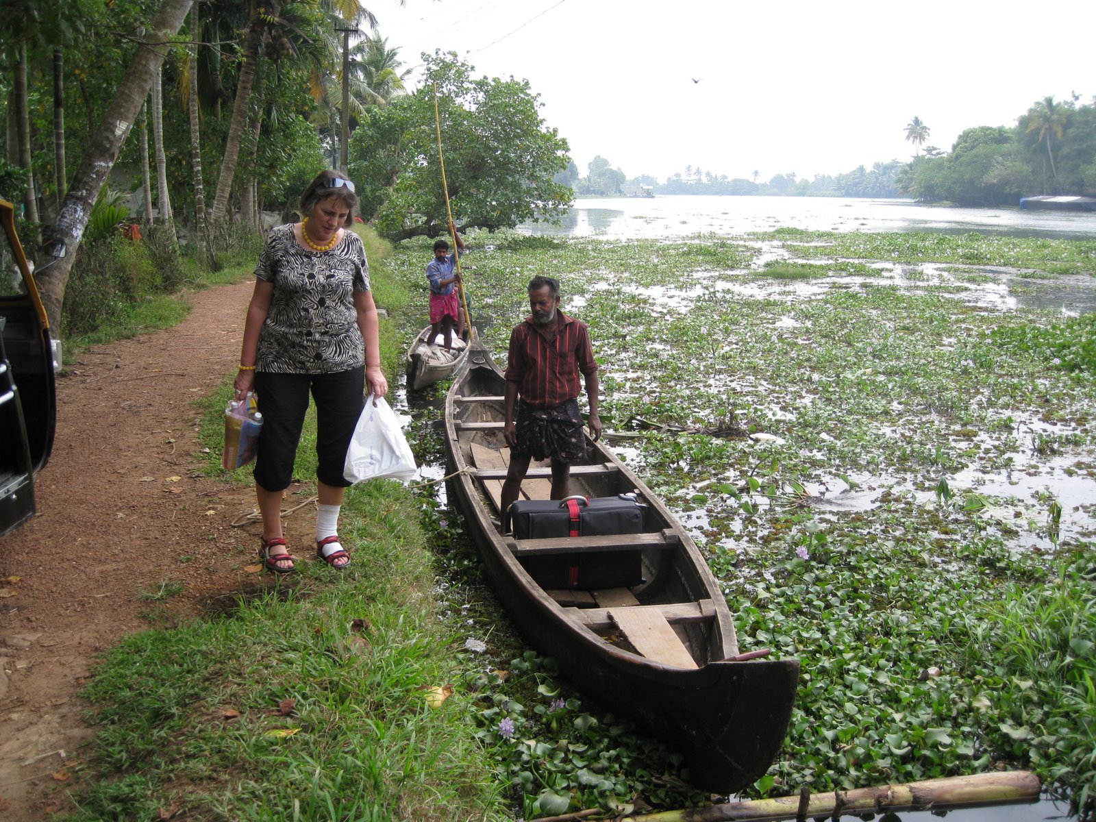 Sidst på eftermiddagen gik vi ombord i den lille kano, for at sejle en fantastik sen eftermiddagstur. Der var en masse fugle, eksotiske træer og charmerende småhuse langs med kanalerne, som vi sejlede ad. Da vi skulle sejle under en lille bro, var der fuld gang i en katolsk festival, så vi stoppede og så på det. En lang procession af præster og folk bevægede sig ud af kirken, over broen og ud mellem rismarkerne til en anden lille landsby. I optoget gik flere grupper af præster med nogle mænd, de bar figurer af Jesus, jomfru Maria og Josef. Rundt om dem gik nogle kvinder med flotte parasoller og et orkester med 3 horn og ca. 20 trommer fulgte dem. Musikerne var klædt i hvide dotier ligesom en bramin, men braminsnoren havde de ikke over skulderen. Et par messedrenge med svingende røgelseskar gik foran en flot klædt præst, og fire kvinder kravlede ud af kirken og rundt om den, det så ret besværligt ud med sari på. Pludselig skød de en masse fyrværkeri af langs med kirken. Hele processionen så mere ud som en hindufestival end som en katolsk festival.